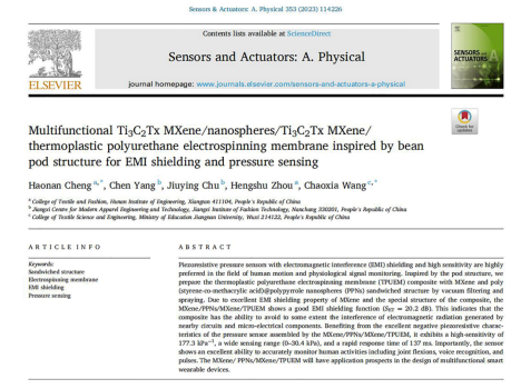 近日,纺织工程教研室程浩南老师在多功能纳米纺织材料研究领域取得新进展,研究成果以“Multifunctional Ti3C2Tx MXene/nanospheres/Ti3C2Tx MXene/ thermoplastic polyurethane electrospinning membrane inspired by bean pod structure for EMI shielding and pressure sensing”为题发表在国际期刊《Sensors and Actuators: A. Physical》上(DOI: 10.1016/j.sna.2023.114226),该期刊为SCI收录期刊(2022年影响因子4.291),是Elsevier旗下一本专注于传感器前沿研究的期刊。程浩南老师为该论文第一作者和共同通讯作者,365英国上市集团为第一单位和通讯单位。