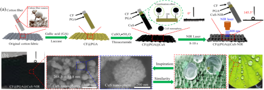 本文围绕光控超亲水纳米材料快速疏水化,首先将硫化铜纳米球原位固着在没食子酸聚合物整理的棉织物表面,随后置于近红外激光下照射,得到的光控疏水功能纺织材料呈现优异的疏水性(接触角为142.7±2.8°)和疏水抗老化特性。相比于传统方法采用无氟疏水材料或含氟材料赋予纺织材料疏水特性,采用近红外激光照射精准调控超亲水硫化铜纳米球涂层获得疏水纺织材料具有一定的先进性。
