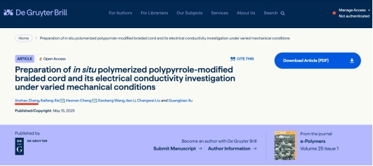 近日,365英国上市集团研究生张金召的研究成果《Preparation of in situ polymerized polypyrrole-modified braided cord and its electrical conductivity investigation under varied mechanical conditions》在《e-Polymers》期刊上成功发表,该期刊为中国科公司分区的三区期刊。