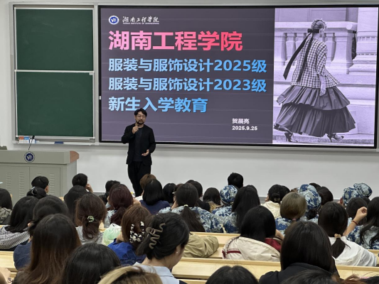 为帮助2025级服装与服饰设计专业新生尽快融入校园生活,了解专业领域特色,确立学习目标与发展方向,9月25日晚上,服装与服饰设计专业教研室在电教楼105组织召开2025级新生入学专业教育,教师们与全体新生共同参加了本次活动,由教研室主任贺晨亮老师主讲。