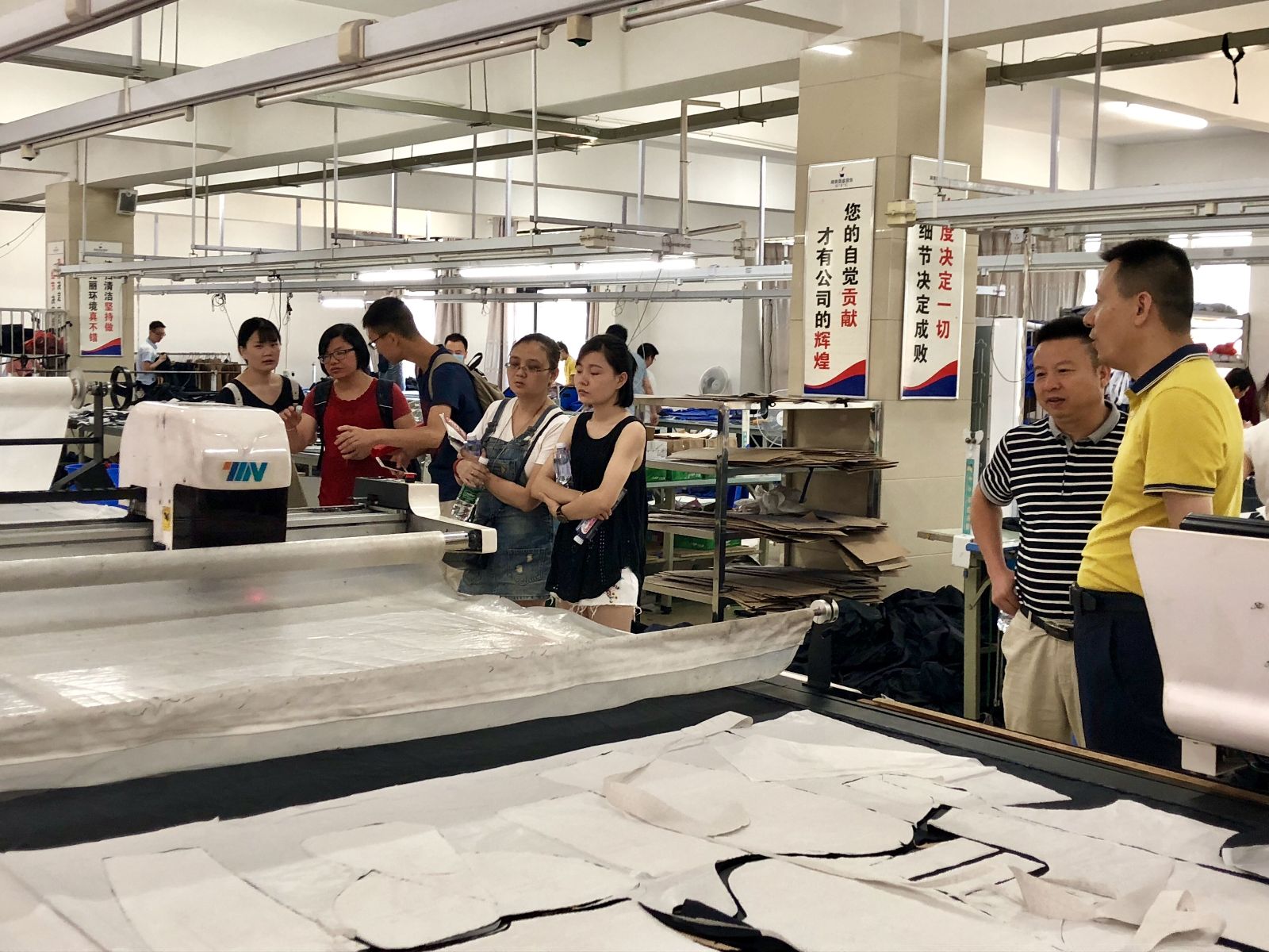 湖南国盛服饰有限公司董事长刘利民首先接待了研究生暑期实践团,他向队员们简要介绍了公司的概况,然后带领大家依次参观了服装生产车间。参观过程中,刘总表示公司近年新引进了一批国内领先的自动化生产设备,显著缩短了工时提高了生产效率,同时最大程度的减少了人为失误造成的服装产量和质量下降。例如,公司原有的普通绘图仪在自动打版排版时耗费大量人力在面料裁剪工序上且精准度不足,但新购入的SINAJET纸板、服装绘图仪则集绘图和面料切割于一体,能够实现智能化、精准化生产。实践团研究生就自动钉扣机与车间技术人员进行了交流,并提出自动钉扣机虽能快速钉扣但牢固程度弱于手工钉扣,如能在设备中加入自动打结功能效果将会更好。