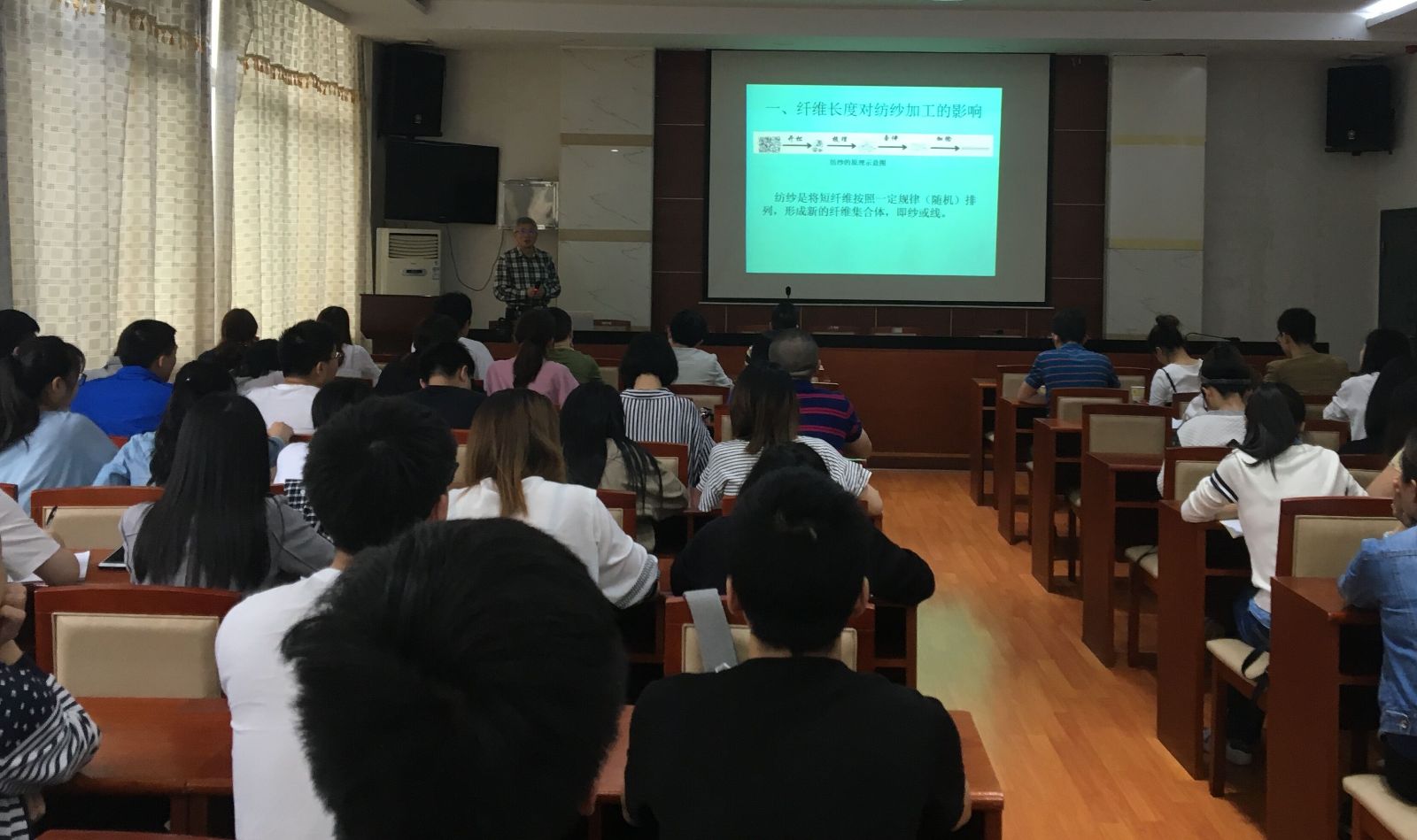 讲座伊始,周衡书副经理向同学们隆重介绍了郁崇文教授,并对郁教授的到来表示热烈欢迎。郁教授平易近人,一直站立为大家讲座,他首先着重介绍了纤维长度对纺纱加工的影响,然后阐释纱线长度与成纱强力的关系,最后对纤维长度特性对成纱的影响做了总结。郁教授的讲座深入浅出、态度严谨,本次讲座数据详实、分析到位,以生动的实例阐述了如何做科研,同学们听得非常投入并积极思考。