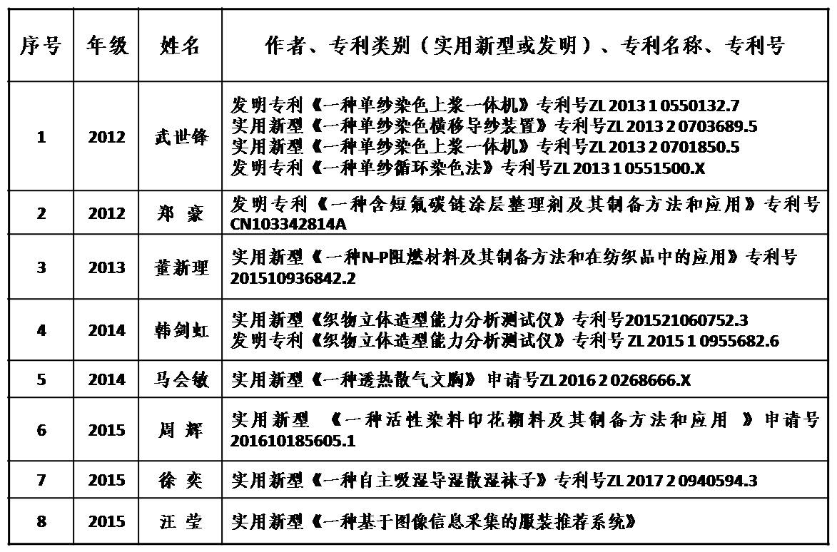 六年来,纺织工程硕士学位点研究生共发表(含收录)论文总数84篇,其中中文核心、A类期刊28篇,SCI收录论文2篇,EI收录论文5篇。申请专利14项,其中发明专利4项,实用新型10项,已授权11项。部分论文和专利摘录如下——