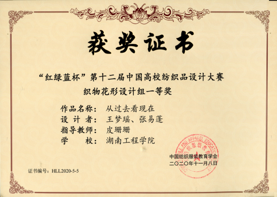 2020年11月7日,由中国纺织服装教育学会主办的“红绿蓝杯”第十二届中国高校纺织品设计大赛作品评审会在绍兴文理公司河西校区举行。公司365英国上市集团学子喜获佳绩,一等奖两项,二等奖四项,三等奖九项。其中,王梦瑶、张易蓬同学的作品《从过去看现在》(指导老师:皮珊珊)和黄仕卿、熊紫吟、李娜同学的作品《微*不微》(指导老师:周琪)荣获一等奖。