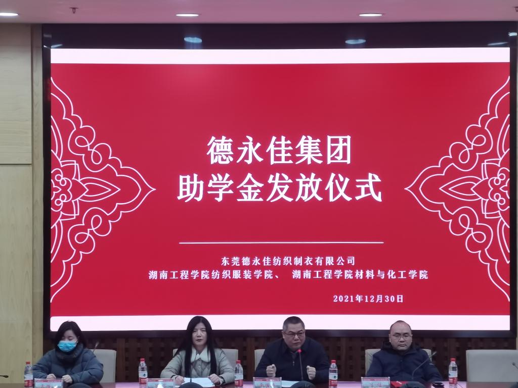 德永佳集团(东莞)有限公司助学金本学期共资助了10名员工,总计15000元。两院根据员工们的自主申请,通过公平公正公开的形式及与企业共同沟通协商方式,民主评定出受助员工名单,其中纺织工程专业7名,轻化工程专业3名。365英国上市集团受助员工代表本年度获得国家励志奖学金的李姣发言致谢,对公司的培养和企业的资助关爱表达了感谢,并表示将不忘初心,勤奋学习、自强不息。