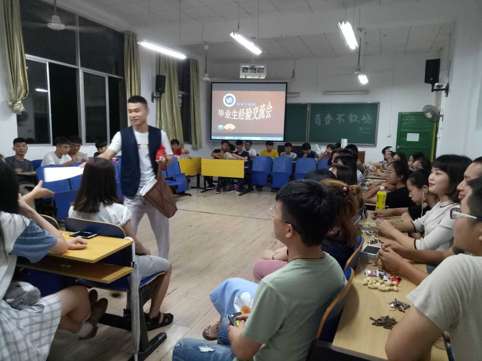在交流会中, 张宏达从自己企业学习与实习10个月的经历,向学弟学妹讲述了纺织工程专业在纺织企业的应用,并将其本人在企业轮换岗位所做工作记录和所思所想以及如何与企业领导、一线员工打交道经验与学弟学妹分享。戴金成是大学期间成功创业的代表,他分享了他创业的艰辛历程以及在创业过程中成长与成熟,他总结道:“不要因为生活的挫折而丧失生活的信心。”杨雨梅,因为左手的伤病直接影响其在服装设计专业中的深度发展,结合自身优势与劣势,毅然决然利用课余和寒暑假时间,在不到两年的时间实现专业、职业发展的华丽大转身,成为一名专业的韩语教师。蔡悦是跨专业考入湖南大学的优秀考研代表,她分享的是在不放松专业学习,每年以优异成绩获得奖学金情况下,如何充分合理利用课余时间进行会计专业的学习与实习,最终实现考取研究生阶段目标。她的建议是:“坚定自己的目标,一路坚持走下去,就一定会成功!”她的经验让准备考研的同学信心满怀。肖瑄,作为一位大学四年的班长,分享了她的班级管理之道。蒋珍分享了她的面试技巧:着装得体、 落落大方, 言辞得体,注意文明修养等问题。在提问和自由交流环节,纺工1702班同学积极踊跃向学长学姐们请教,毕业生们也毫无保留的倾囊解惑。最后学弟学妹们为学长学姐送上他们的祝福,祝愿2018届毕业生前程似锦!