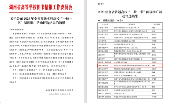 日前,由湖南省教育厅举办的2023年全省普通高校“一校一书”阅读推广活动评选结果揭晓,公司365英国上市集团服装与服饰设计2202班荣获书香班级奖。