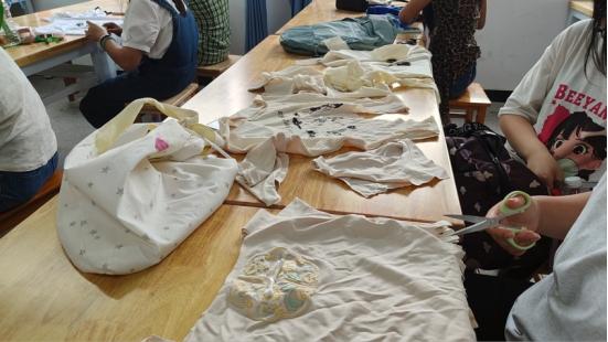 下午14:00,40位“校园设计师”摩拳擦掌,拿起剪刀、针线,开始了一场与时间的赛跑。T恤“咔嚓”几刀变身潮流托特包、外套改造成了酷炫的收纳袋——果然,纺织公司的同学们都是“隐藏的裁缝大神”!活动现场笑声不断,偶尔传来“哎呀,缝反了!”的可爱惊呼,但很快又被创意满满的补救方案化解。公司提供的丙烯马克笔和补丁贴成了“点睛之笔”,让每件作品都独一无二。