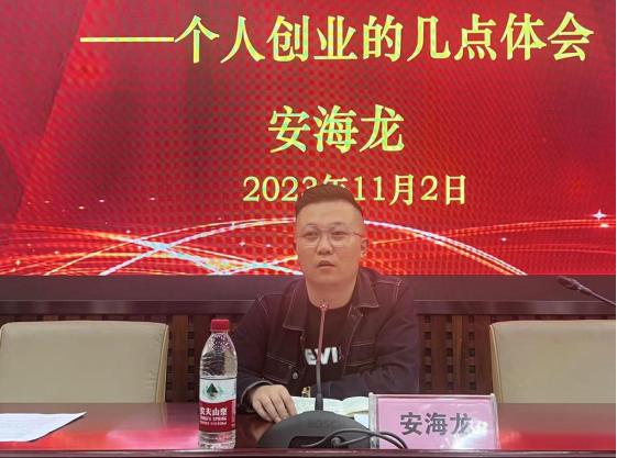 安海龙以“珍惜青春,助力创业”为题,详细讲述了自己的创业故事。他表示,创业的关键要素是创新与勇气,要不断探寻新的方法和机会,不断学习并及时改进。他勉励同学们在大学四年中要认真学好专业知识的同时,也要充分利用图书馆文献资源,扩大知识视野;充分利用学团组织等成长平台,提高合作意识和创新能力。最后,他希望学弟学妹们提前进行个人职业规划,预祝学弟学妹在创新创业的大潮中实现青春梦想、体现人生价值。