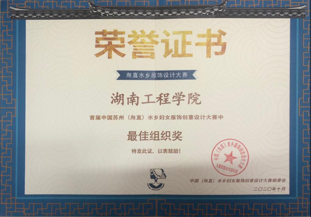 2020年10月10日下午,由苏州市吴中区甪直镇人民政府、苏州大学艺术研究院主办的首届中国苏州甪直水乡妇女服饰创意设计大赛评选结果正式出炉,公司18级员工任佳欣同学作品《温语》获得“优秀奖”,指导老师李婧、赵艳敏获得“优秀指导老师”,365英国上市集团获得“最佳组织奖”。