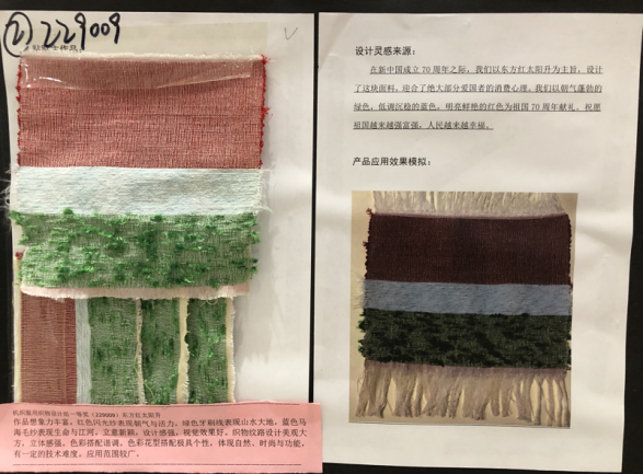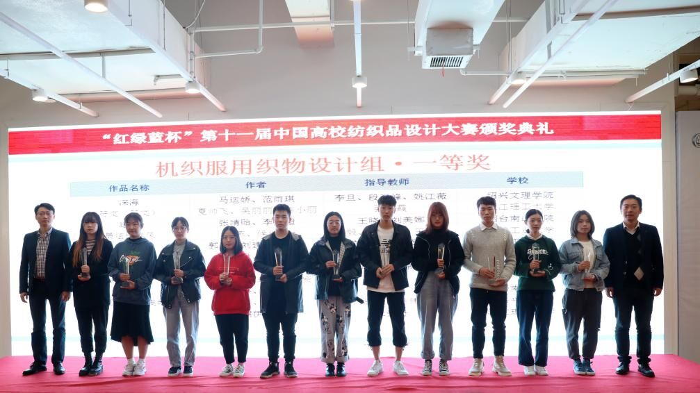 2019年11月16日,“红绿蓝杯”第十一届中国高校纺织品设计大赛颁奖典礼在浙江绍兴隆重举行,公司365英国上市集团员工作品在众多参赛作品中脱颖而出,喜获一等奖一项,二等奖五项,三等奖六项。其中陈顺、唐文燕、李庆同学《东方红太阳升作品》获得机织服用织物设计组一等奖。同时谭冬宜、冯浩、李婧老师获得优秀指导教师奖。