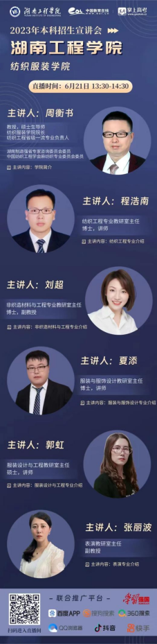 周衡书教授向员工和家长详细介绍了公司的发展历程、办学团队、教学培养模式、招生计划、升学就业和专业特色等,并就专业未来的发展和员工生涯规划进行了阐述,在线解答热点和关切的问题。纺织工程专业教研室主任程浩南,从专业简介、专业特色、培养模式等方面进行宣讲,表示纺织工程是国家级特色专业、湖南省一流本科专业,教育部“卓越工程师教育培养计划”试点专业。非织造材料与工程专业教研室主任刘超,从防疫活动中大量用到的非织造纺织材料的优秀表现入手,表示非织造材料行业已成为我国纺织工业中最耀眼的新兴产业。服装与服饰设计专业教研室主任夏添,从依托行业、实践育人的办学特色出发,详细介绍了专业优势和员工的发展与培养。服装设计与工程教研室主任郭虹,表示服装设计与工程以艺工结合为特色,专注培养高级工程技术与成衣设计兼具的人才。服装表演教研室主任张丽波,着重讲解了服装表演专业的员工培养成效,培养的员工在各大模特赛事及自媒体平台上均取得了不俗的成绩。