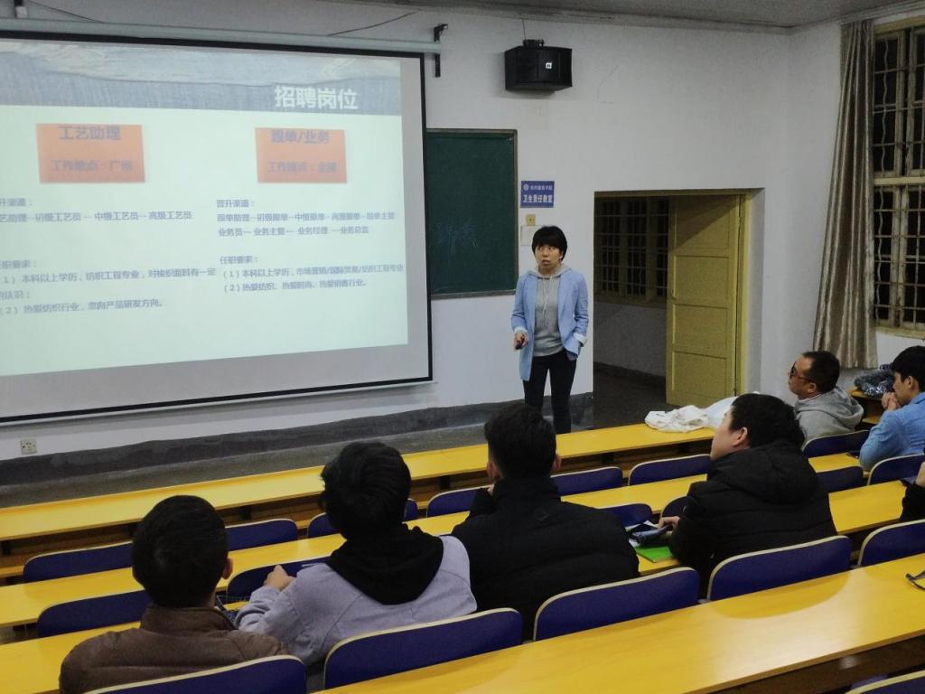 11月15日晚7点,北江纺织股份有限公司招聘宣讲会在电教101召开,该公司人事部经理张涛主讲了这次会议。公司许众多优秀应届毕业生参加了这次会议。