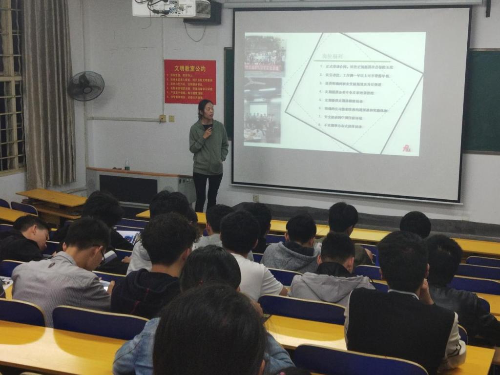 宣讲会伊始,公司负责人向同学们亲切问好后开始简单介绍了公司的整个发展历程,告诉同学们公司是如何由一家传统纺织作坊一步步发展成为一家面向世界的大企业的。然后,主讲人员详细地介绍了公司主打产品——织带,织带可谓渗透到了生活的方方面面,常见的背包、安全带都离不开它,并表示公司的产品涉及到休闲、户外运动乃至医疗等多个领域。并且公司不仅和大量国际知名品牌合作,生产机器上,工厂引进了许多自动化机器,节约了大量劳动力成本,有许多高科技设备,使工作更加便利,而且公司还有自己专业的研发团队,已经取得了多项专利,这能给刚踏出校园的老员工们一个很好的施展才华舞台,在专业的指导下能更好地激发同学们的潜能。最后,她介绍了公司有良好的工作生活环境,宿舍家电、休闲娱乐一应俱全,能够为员工提供最舒适的工作生活环境,并表示特大纺织品(深圳)有限公司期待着各位同学的加入。