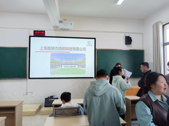 嘉麟杰纺织科技有限公司是一家从事研发设计、生产制造、营销服务于一体的综合性、国际化纺织企业。公司招聘负责人葛健以PPT和视频的形式详细介绍了公司背景、公司文化及现状,对行业前景和招聘岗位进行了详细分析。会上,招聘人员还就同学们所关心的岗位要求以及职业生涯规划等问题进行了互动交流。