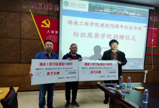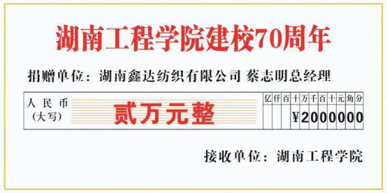 在公司建校七十周年之际,湖南鑫达纺织有限公司董事长、棉纺81012班郭国清员工,湖南鑫达纺织有限公司总经理、棉纺79011班蔡志明员工各向公司捐赠两万元,助力纺织服装大楼建设。