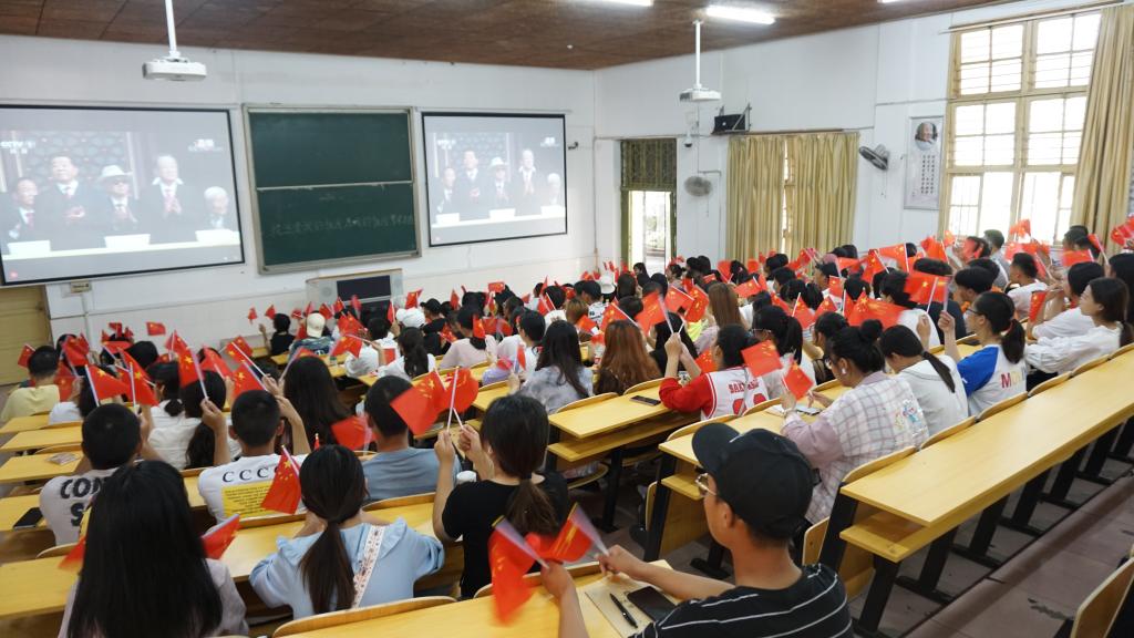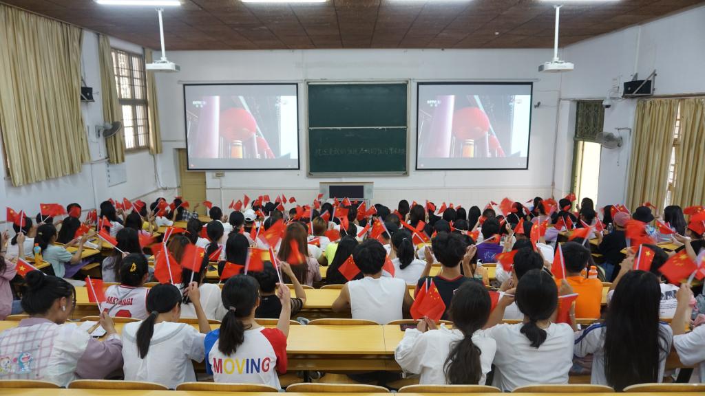 上午九点,活动正式开始,同学们纷纷围坐在一起,共同见证这一光辉,感受着团结、和谐、奋进的时代脉动。笑声、掌声、赞叹声彼此交融,会议室里洋溢着欢快、自豪的气氛。70响礼炮声拉开了阅兵式序幕,同学们全体起立,跟随电视直播向国旗行注目礼、高唱中华人民共和国国歌,挥动手中的小红旗,心中的自豪感油然而生。接下来同学们在隆重热烈的氛围中观看阅兵仪式,空中护旗梯队迎面而来。这次阅兵编59个方队和联合军乐团,总规模约1.5万人,各型飞机160余架、装备580台,是近几次阅兵中规模最大的一次。当从枪林弹雨中走来的抗战老兵乘车而来;当威武雄壮之师迈着整齐划一的步伐正步走过天安门城楼;当各式各样的新式装甲车隆隆地向广场驶来;当参加阅兵式的机群拉着彩带掠过苍穹…………荧幕前的同学们情不自禁地鼓掌欢呼。在现场,鲜艳热烈的五星红旗,是同学们真挚的爱与祝福;如潮般的掌声,是所有人的骄傲与自豪。观看完阅兵式直播后,同学们纷纷为威武雄壮的中国军人点赞,热烈讨论着庆典中的精彩场景。国庆70周年的庆典气势恢宏、振奋人心,集中体现了新中国70年来取得的辉煌成就,充分展示了大国崛起的豪迈和屹立世界民族之林的雄风。历史再次证明,只有坚持中国共产党的领导、坚定不移地走中国特色社会主义道路,才能实现中华民族的伟大复兴。
