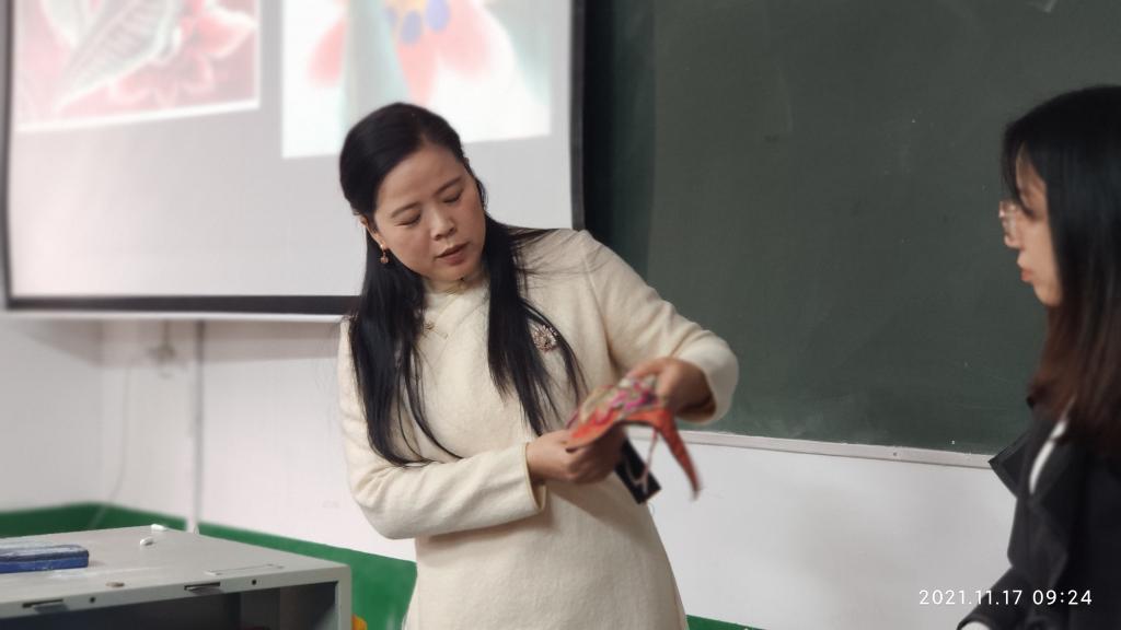 2021年11月17日上午08:30,湖南省非物质文化遗产技艺“桃源刺绣”传承人罗明华女士在北校区4教102为公司18级服设全体员工作题为“桃源刺绣传习与创新”的专题讲座。服装与服饰设计专业教师夏添、杨梅、彭迪、迟晓丽、卿少宁、彭小琴、贺晨亮7位老师出席本次讲座,夏添老师担任本次讲座主持。