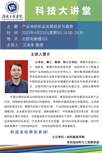 4月23日下午,非织造材料与工程(非织造)教研室邀请湘潭市高层次人才、湘潭市科技特派专家、纺织科学与工程重点学科产业用纺织品方向学术带头人、非织造材料与工程专业负责人汪泽幸教授在北院电教楼101教室进行了一场题为《产业用纺织品发展现状与趋势》的学术讲座。本次讲座由非织造教研室主任刘超主持,非织造和纺织工程专业共100余名师生到场聆听。