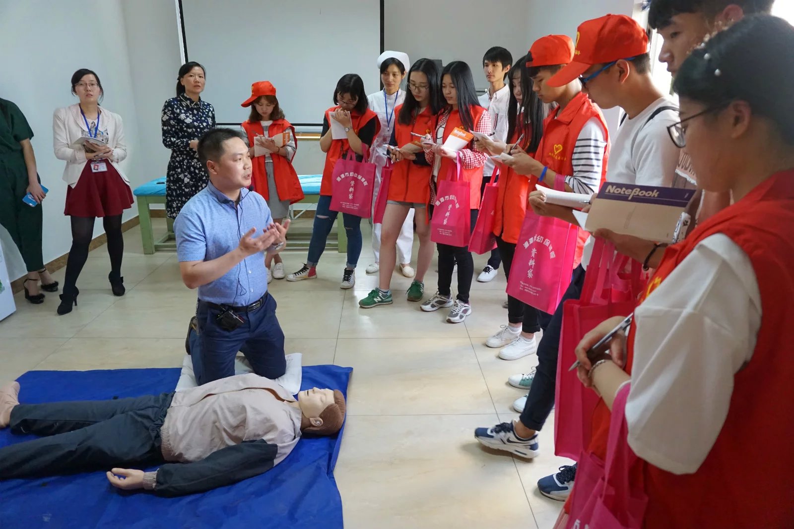 新生儿科主任黄跃华指导志愿者进行心肺复苏术