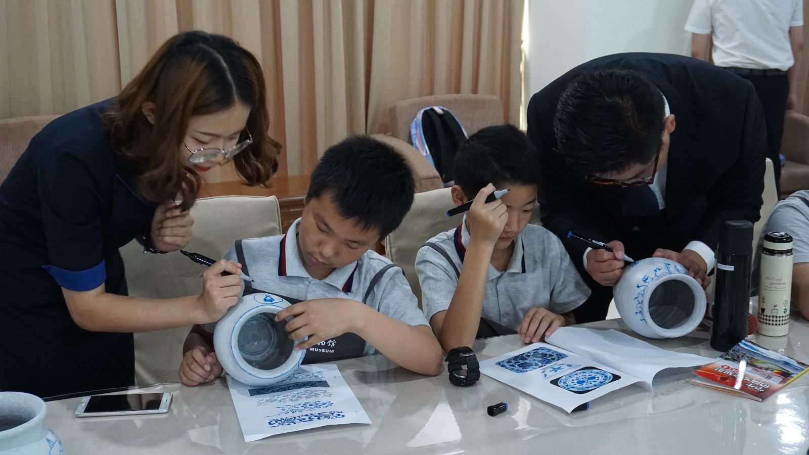 最后,公司志愿者利用他们的专业优势,对现场参与青花瓷绘制活动进行指导,手工引导孩子们素胎勾勒青花瓷,趣味讲解湖湘文化、湘潭博物馆历史知识及消防安全知识等。