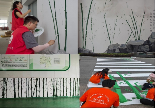 为确保工程高效高质完成,志愿者们根据当地实际情况与需求,对绘画的面积进行测量确定尺寸,并就绘画主题、创作流程等多次讨论研究,最终确定以更为贴合企业产品类型和发展主题的“竹”作为主要绘画元素。志愿者们分工明确,各司其职,刷漆、定点、调制、勾勒、点缀、着色,一个个“乡村彩绘师”配合默契,用手中的画笔,将翠绿的竹子栩栩如生地呈现于墙体和道路上,微风拂过,仿佛能看到竹子轻轻摇曳。在绘制过程中,队员们将与竹相关的诗词故事进行巧妙嵌入以增加墙绘的叙事性。日影下热气滚滚,他们挥墨入云,画线成风,用手中的笔墨,为产业振兴添上浓墨重彩的一笔。最终绘制4面彩墙,一条创意斑马线,绘制面积近90平方米,以实际行动助力美丽乡村建设。