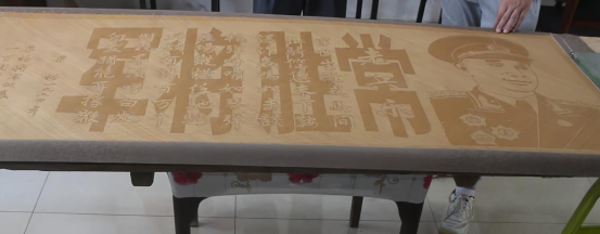 老先生热情将志愿者们引进他的工作室,摊开一幅幅气势磅礴的艺术大作,详细介绍手工竹编作品的制作过程,他在原有的竹编色彩图案画作的基础上增加了竹编花鸟平面提花竹编书法,其中为纪念粟裕将军诞辰一百周年,作为家乡手艺人的肖体贵历经两年时间手工编织的精美作品《常胜将军》就是字里套字的典型代表,常胜将军四个大字内套了许多小字,顺光看字画立体感强,逆光看字画如碑刻嵌凿,作品气势恢宏、字迹清晰、人物传神。志愿者们听得如此如醉,跃跃欲试,老先生拿出两幅半成品现场授课,让志愿者切身感受到这一经一纬编制过程的艰辛与不易。竹编工艺对眼神的敏锐度以及精神的高度专注度要求极为严苛,且该工艺复杂,不能批量和机械化生产,经济效益不高,对学艺人的天赋有一定要求,肖时贵老先生表示:“竹编技艺历史悠久,作品在海内外参展也备受欢迎,虽然现在小儿子作为第八代传人在努力学习,但还是想让这门绝技发扬光大,只要大家肯学,我愿意无条件倾囊相授!”