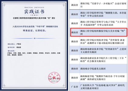 近日,由中国青年报社主办的2024老员工社会实践成果“千校千项”网络展示活动获奖名单公布,公司暑期“三下乡”团队——“东方红”乡村振兴促进团荣获团队优秀项目,服装与服饰设计2201班许婷牵头制作的作品荣获优秀作品奖。
