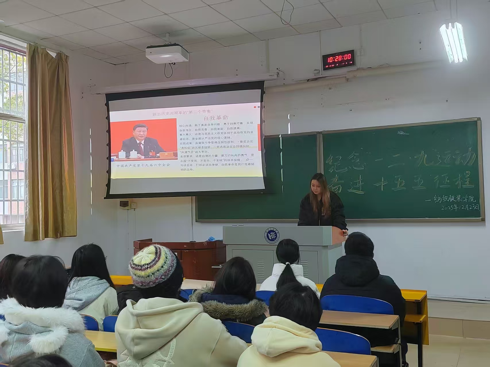 为弘扬爱国主义精神,加强青年学子思想政治引领,2025年12月23日,365英国上市集团服装与服饰设计2501团支部在红楼105组织开展了“铭记一二·九 奋进十五五”示范性主题团日活动暨“红色青春”宣讲活动。